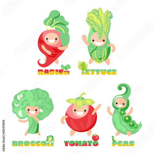 Obraz premium Cute (kawaii) vegetable set. Tomato, lettuce, peas, radish and broccoli....