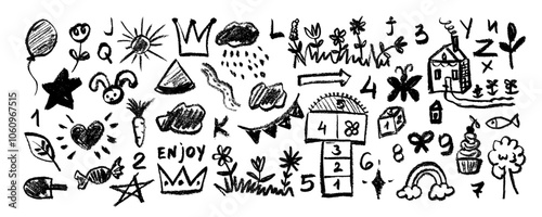 © Vitalii, Fototapeta premium Cute kid illustration with silhouettes flowers, cloud, crown, stars, summer . Hand drawn doodle sketch cute vector school chalk background. Kids pattern in style doodle, hand drawn crayon.