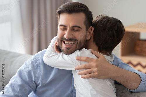 © fizkes, Fototapeta premium Cute kid son embracing affectionate dad congratulating on fathers day