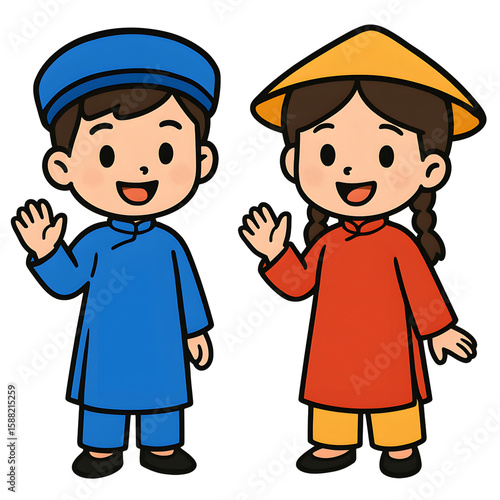 © Napapat, Fototapeta premium Cute Kids Clipart in Costume Themes , Two cheerful children in traditional Asian outfits, one in a blue robe and the other in a red robe with a yellow hat, waving joyfully in a friendly manner