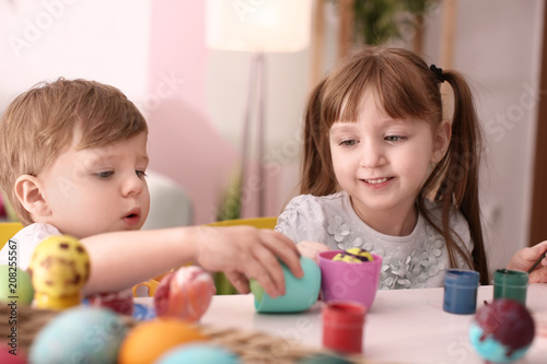 Fototapeta premium Cute kids painting Easter eggs together at table