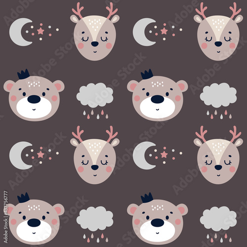 © ejevyaka, Fototapeta premium Cute kids vector seamless pattern with funny baby animals, bear and elk, deer, moon, stars, clouds, rain. Cartoon illustration for baby shower, nursery room decor, children design