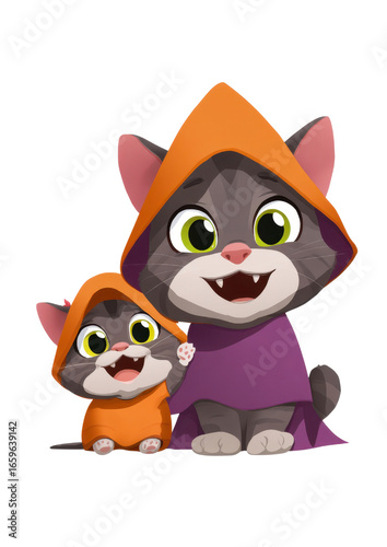 Fototapeta premium Cute kitten in halloween costume holds pumpkin, celebrating Halloween...