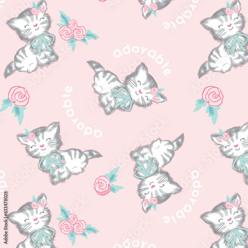 Fototapeta premium Cute kitten print design pattern for seamless bedding, clothes or rooms for baby girls.