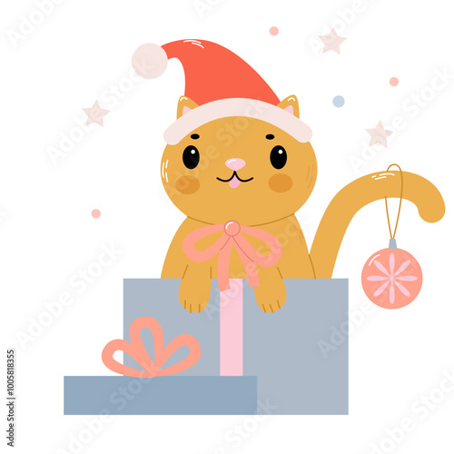 Fototapeta premium cute kitten sitting in a gift box wearing a Christmas red hat