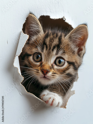 © Rymden, Naklejka premium Cute kitten sticking its head out of the hole in paper background