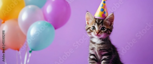 © BerkahStock, Fototapeta premium Cute kitten wearing a party hat with colorful balloons in the background.