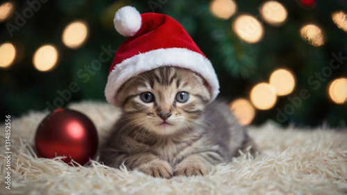 © aditya, Obraz premium Cute kitten wearing santa hat lying down with festive lights in the background
