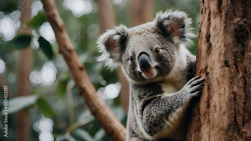© Muqadas , Naklejka premium cute Koala Bear climbing on the tree looking at the camera, , copy space