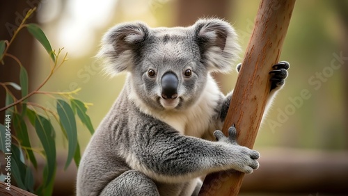 © Rupanala, Fototapeta premium Cute koala clinging to a eucalyptus tree branch looking directly at the viewer