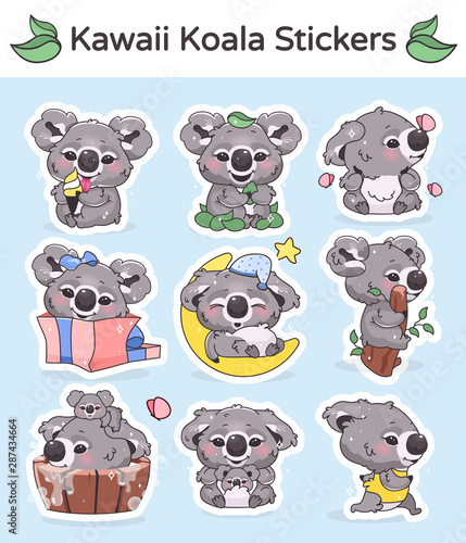 Fototapeta premium Cute koala mobile app kawaii cartoon characters stickers pack. Messaging...