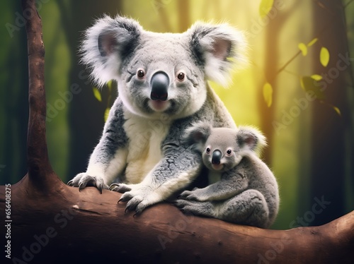 Fototapeta premium Cute koala mother with her baby on the eucalyptus tree