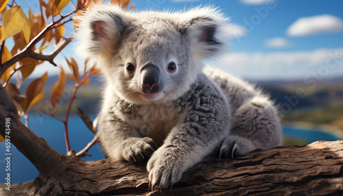 © djvstock, Naklejka premium Cute koala sitting on a tree branch, looking at camera generated by AI