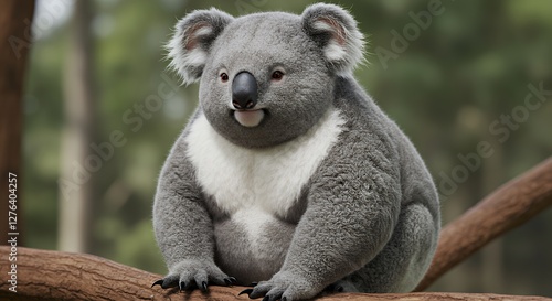 Naklejka premium Cute Koala Sitting on Branch with Eucalyptus Trees in Background