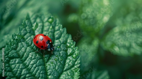 Fototapeta premium Cute ladybug on juicy green leaf . biodiversity