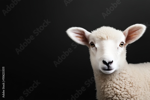 © olegganko, Naklejka premium Cute lamb portrait showcasing white wool and curious expression in a studio setting