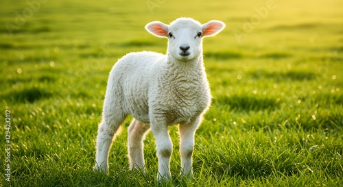 © Golden Bamboo Studio, Obraz premium Cute Lamb Standing in Grassy Field During Golden Hour Sunlight - Easter Lamb in a Spring Meadow