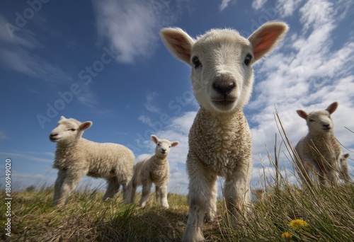 Obraz premium Cute lambs in a field, wide-angle shot