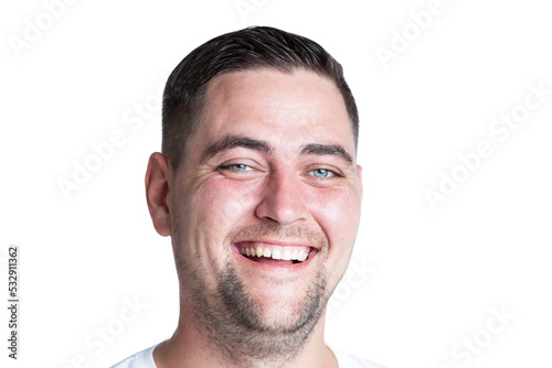 © Анна Демидова, Fototapeta premium Cute laughing guy in a white poppy. Emotions, positivity and optimism. Close-up. Isolated on white background.