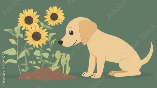 © Hungarian, Obraz premium Cute light-yellow dog near sunflowers in the garden.