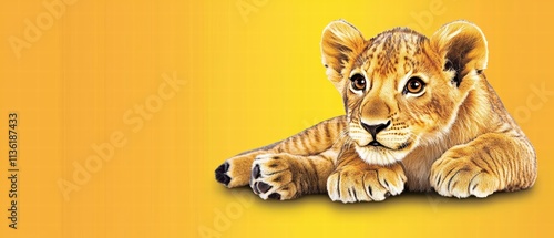© AssanAI.Studio, Obraz premium Cute Lion Cub Relaxing on a Bright Yellow Background