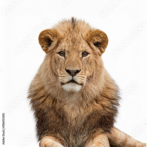 © Rindi, Obraz premium Cute lion sitting isolated on white background. Generated image