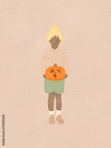 © Emi Tse, Fototapeta premium cute little African American girl holding a Halloween pumpkin