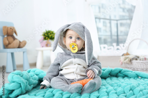 Naklejka premium Cute little baby in bunny costume sitting on plaid at home