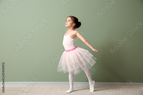 Naklejka premium Cute little ballerina dancing near color wall