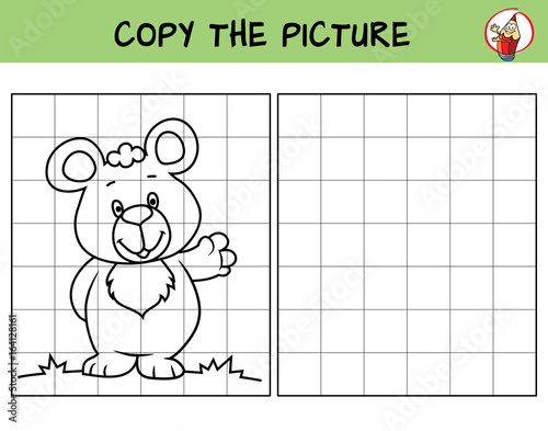 Fototapeta premium Cute little bear. Copy the picture. Coloring book. Educational game for children. Cartoon vector illustration