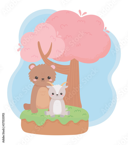 Fototapeta premium cute little bear goat tree cartoon animals in a natural landscape