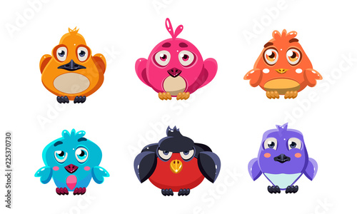 Naklejka premium Cute little birds set, colorful cartoon glossy birdie, user interface assets for mobile apps or video games vector Illustration on a white background