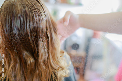 © Alinsa, Naklejka premium Cute little blonde curly girl at the beauty salon.
