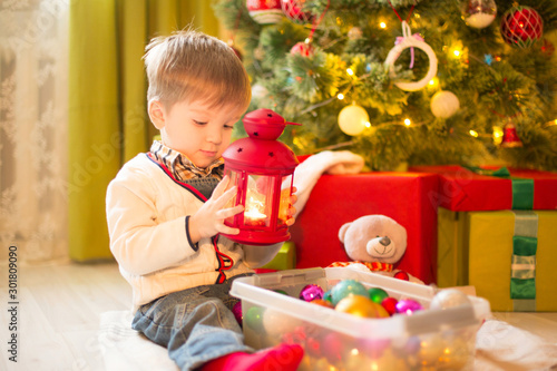 © Alik Mulikov, Obraz premium Cute little boy child decorating Christmas tree in room. Christmas or New Year holiday
