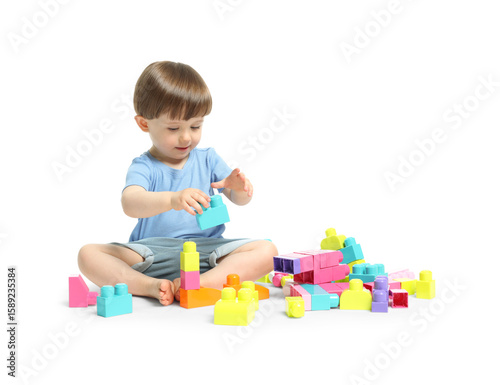 © New Africa, Obraz premium Cute little boy playing with building bricks on white background