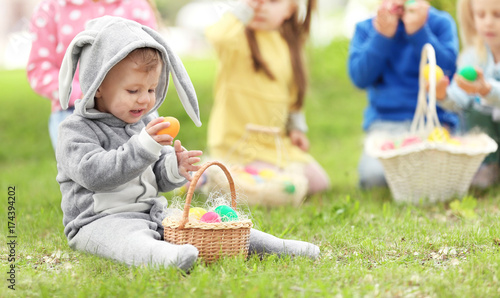 Naklejka premium Cute little boy with basket on green grass in park. Easter egg hunt concept