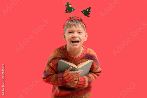Naklejka premium Cute little boy with book on red background. Christmas celebration