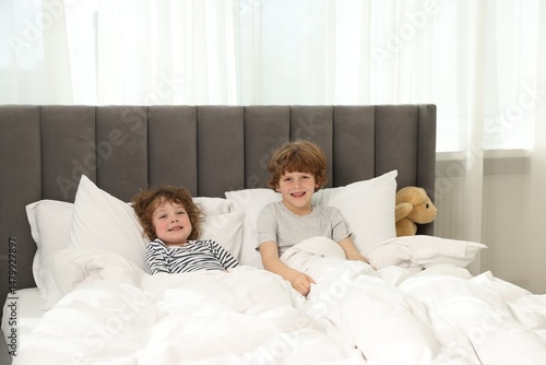 Fototapeta premium Cute little brothers laying in bed at home