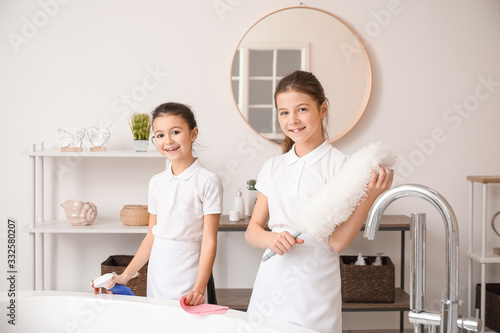 Fototapeta premium Cute little chambermaids cleaning bathroom