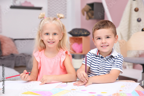 Fototapeta premium Cute little children drawing at home