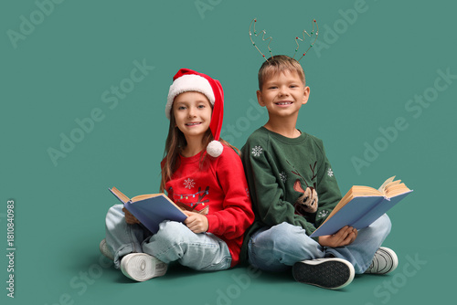 © Pixel-Shot, Naklejka premium Cute little children reading Christmas story on green background