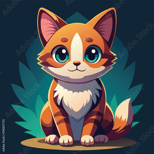 © Evgenia, Fototapeta premium Cute little chubby red kitten with white stripes and big green eyes sitting straight on dark green background with floral elements