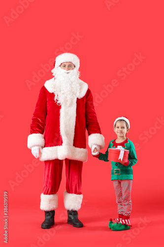 Fototapeta premium Cute little elf with Santa Claus and Christmas gift on color background
