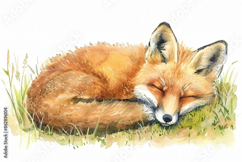 © Sara_P, Naklejka premium Cute little fox curled up in a meadow Watercolor illustration