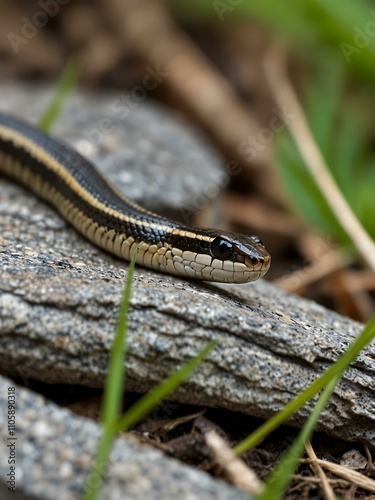 Obraz premium Cute little garter snake in a Benezette, PA backyard.