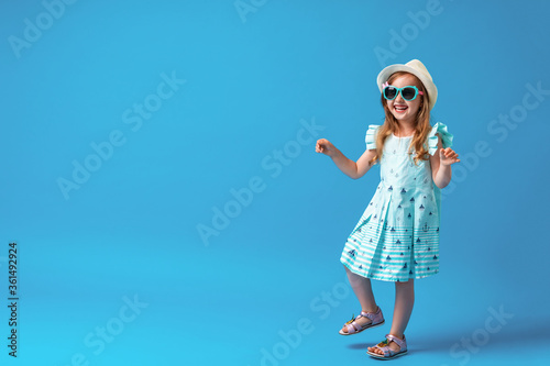 Fototapeta premium cute little girl in a dress, hat and sunglasses poses on a blue background