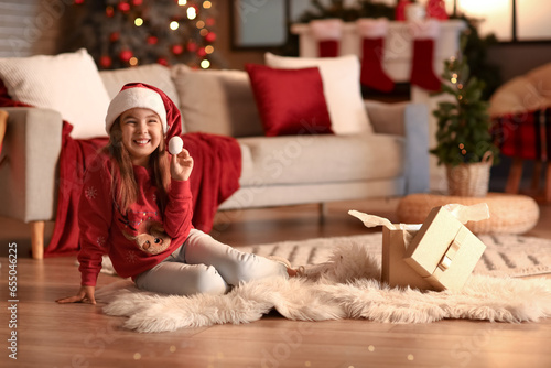 Obraz premium Cute little girl in Santa hat at home on Christmas eve