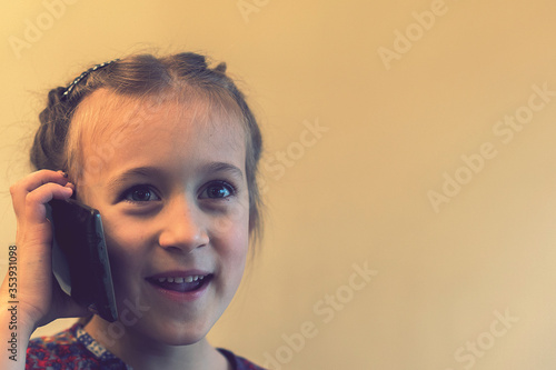 Fototapeta premium Cute little girl is talking on the mobile phone and smiling. Girl talking on smartphone. Little kid using smartphone. Smartphone in hand. toned
