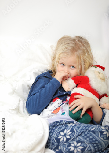 © a.bahdanava, Fototapeta premium Cute little girl is very surprised and excited, lying on white background and holding little santa claus, looking straight. Christmas holiday