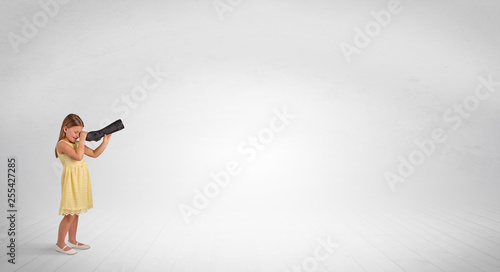 Obraz premium Cute little girl looking through spyglass to an empty space